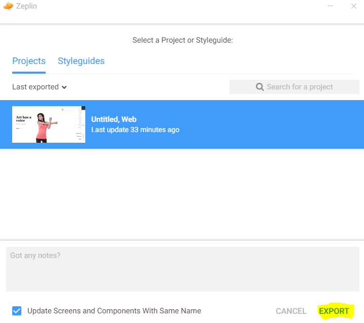 - 메뉴 클릭 -> 내보내기 -> Zeplin