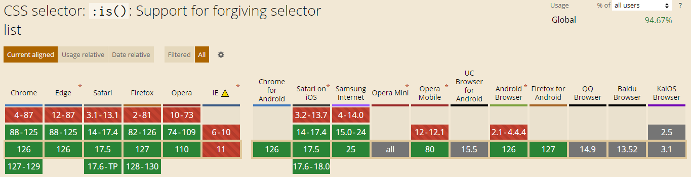 - 특이성: 괄호 안에서 가장 높은 특이성을 가진 선택자의 특이성을 상속받는다. 즉, 선택자 중 하나라도 높은 특이성을 가지면, 전체 :is()의 특이성도 높아진다.