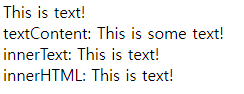 innerText는 "사람이 읽을 수 있는" 요소만 처리한다. - textContent는 노드의 모든 요소를 반환한다. innerText는 스타일링을 고려하며, "숨겨진" 요소의 텍스트는 반환하지 않는다.